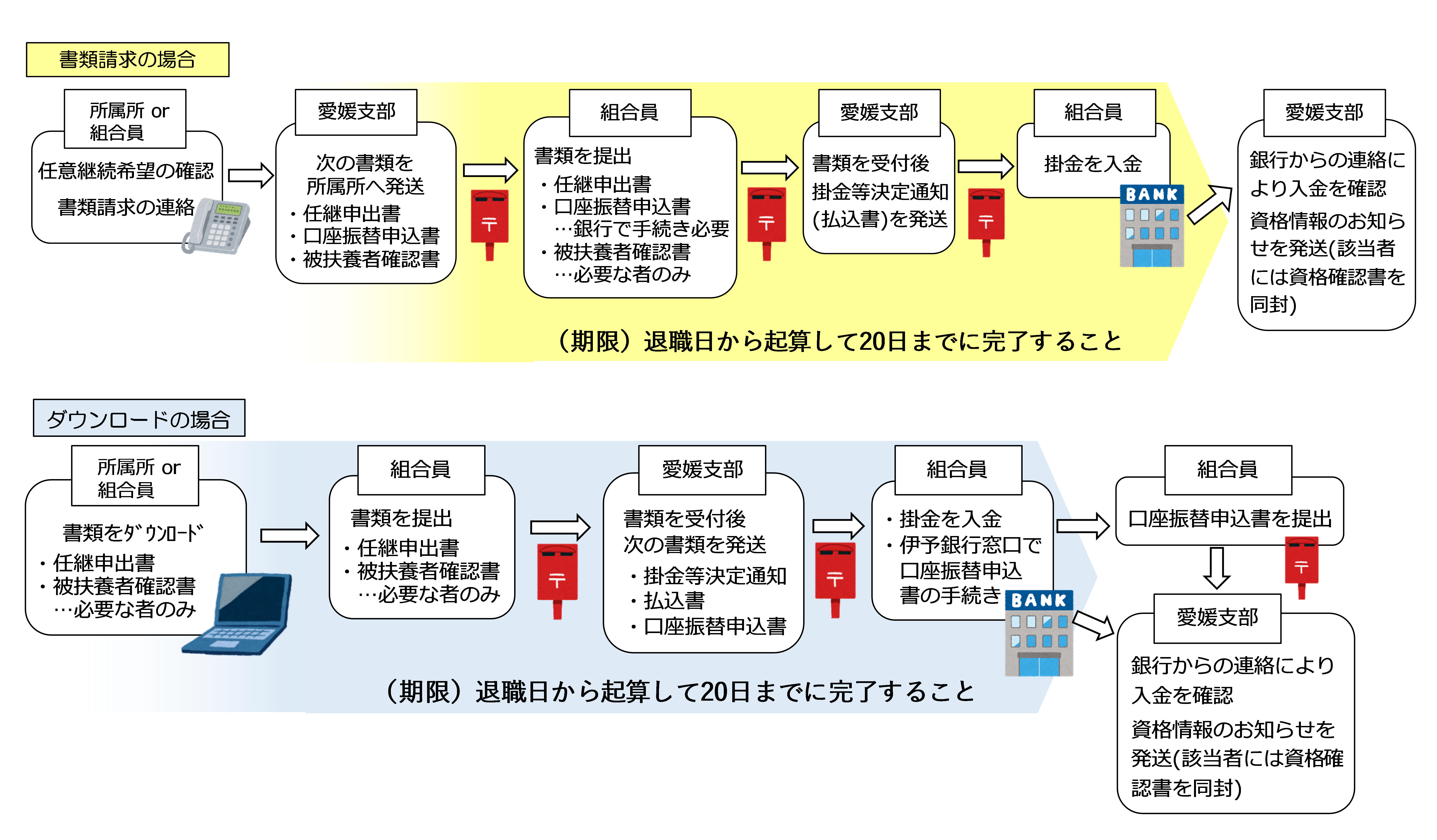 愛媛支部に書類を請求した場合は、事前に送付します。ホームページから書類をダウンロードした場合は、任意継続組合員申出書を提出後、掛金等決定通知書と併せて送付します。